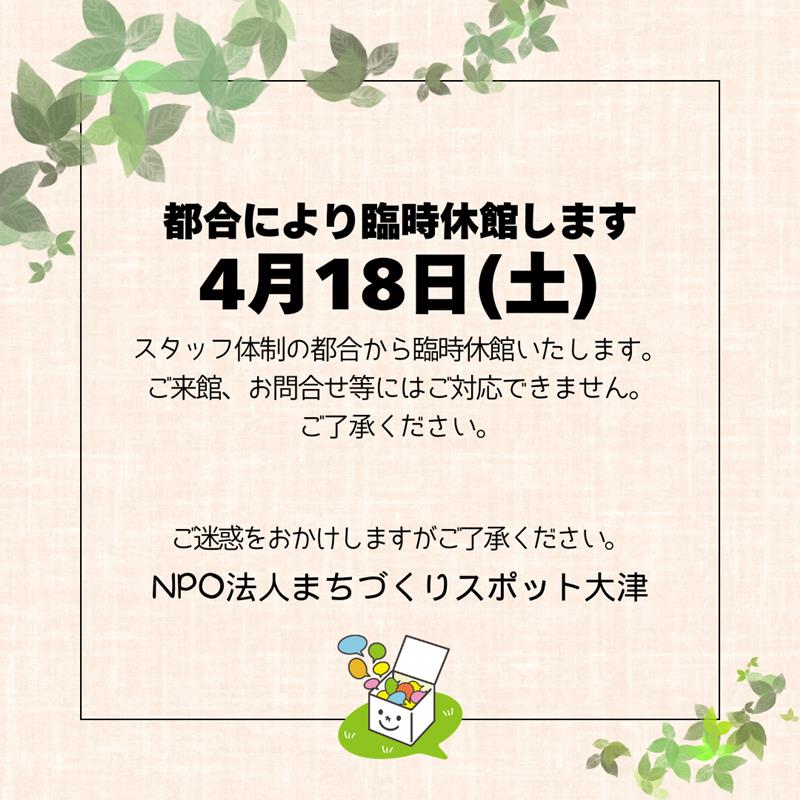 明日4月18日(土)はスタッフ体制の都合から臨時休館いたします。